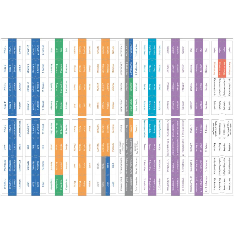 Hiermit kann man jede Bibelstelle viel schneller aufschlagen! Dieses Bibel-Griffregister zeigt an, wo jedes einzelne biblische Buch beginnt. Das Farbsystem macht erkennbar, zu welchem Bereich das betreffende biblische Buch gehört. Enthalten sind auch Register-Reiter für Apokryphen und katholische Bibelbuch-Bezeichnungen, ferner weitere Reiter für verschiedene Studienbibeln. Dieses Bibel-Griffregister kann leicht in die eigene Bibel eingeklebt werden.