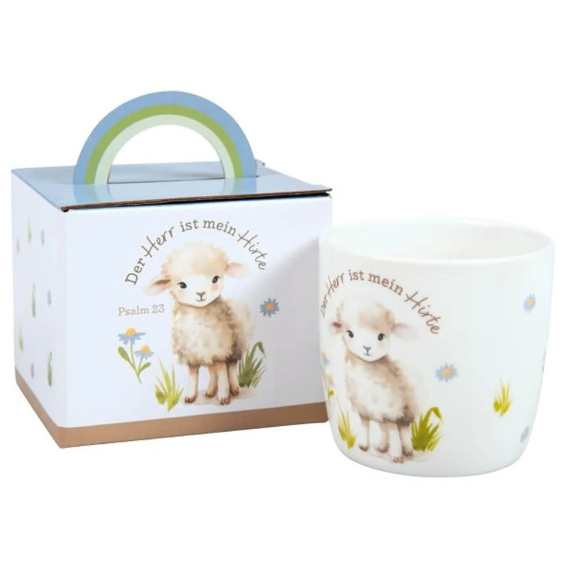 Ideale Größe für Kinder: Tasse mit niedlichem Schäfchen-Motiv und Vers: „Der Herr ist mein Hirte“. In passender Verpackung mit Tragegriff