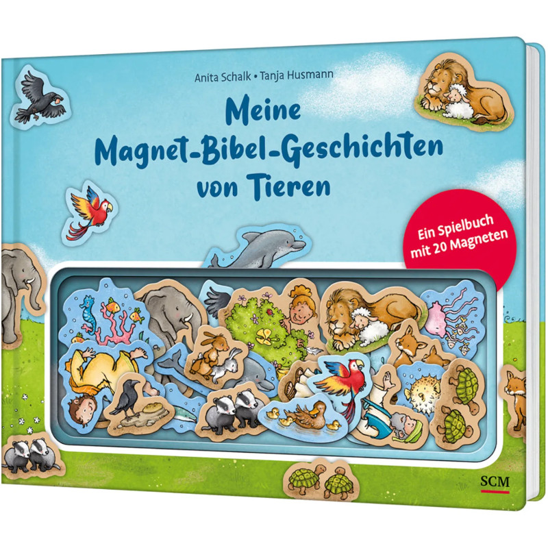 Vier tolle Bibelgeschichten lassen sich auf diesen magnetischen Seiten entdecken: die Schöpfung, Noahs Arche, Elia wird von Raben versorgt, Jona und der Wal.