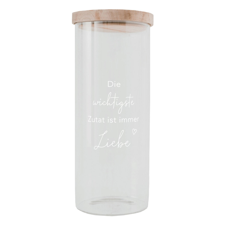 Entdecke unser wunderschönes und praktisches Vorratsglas Liebe 25 cm aus Borosilikatglas mit Akazienholz Deckel.