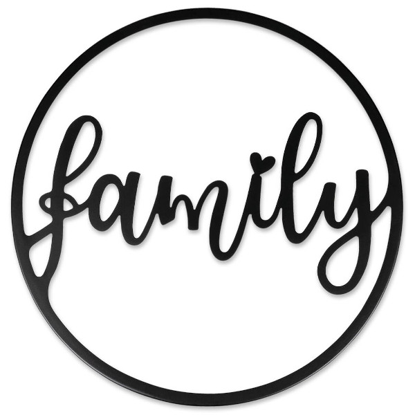 Sehr moderne Wanddeko „family“ im Vintage-Stil mit geschwungenem Schriftzug im Kreis.